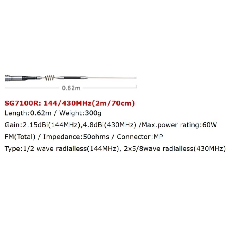 Gain:2.15dBi(144MHz),4.8dBi(430MHz) /Max.power rating:60W FM(Total) / Impedance:50ohms / Connector:MP